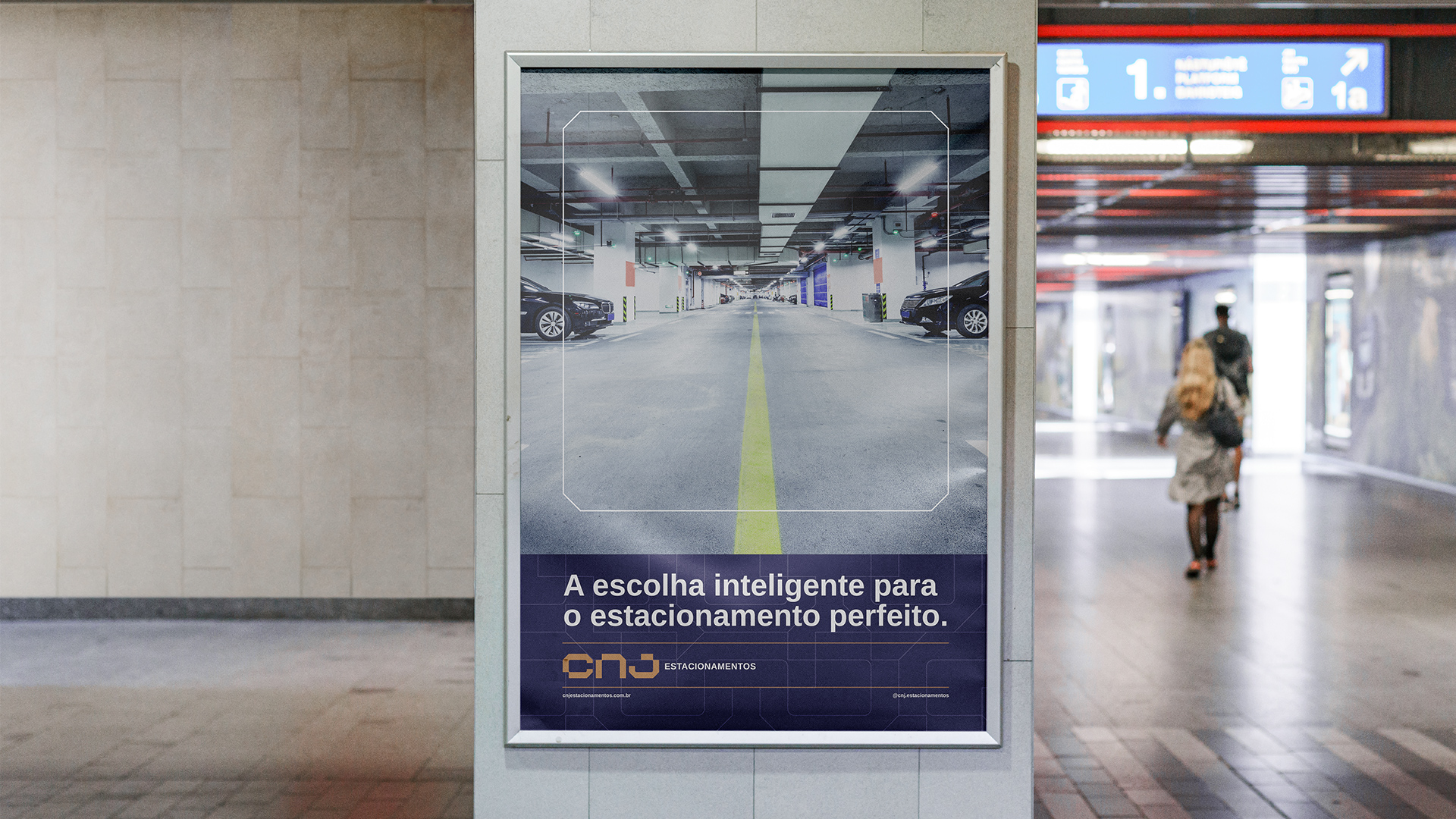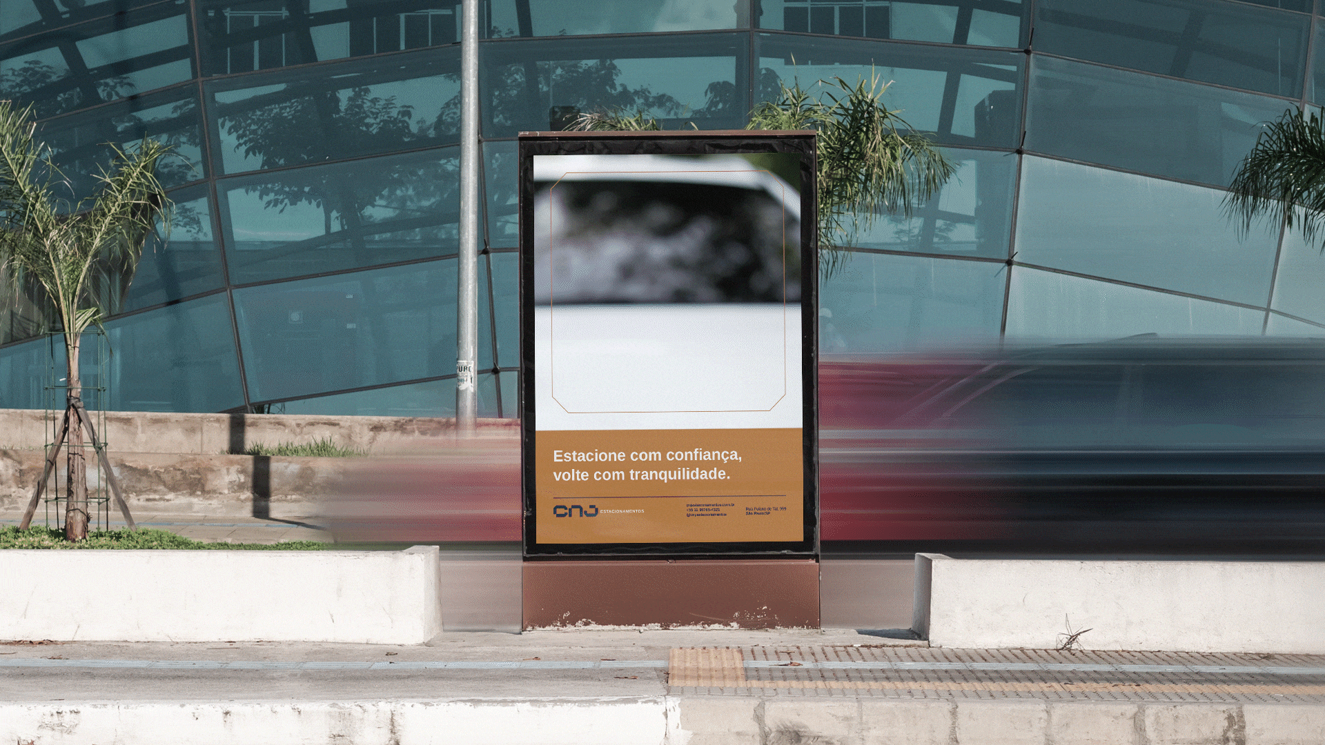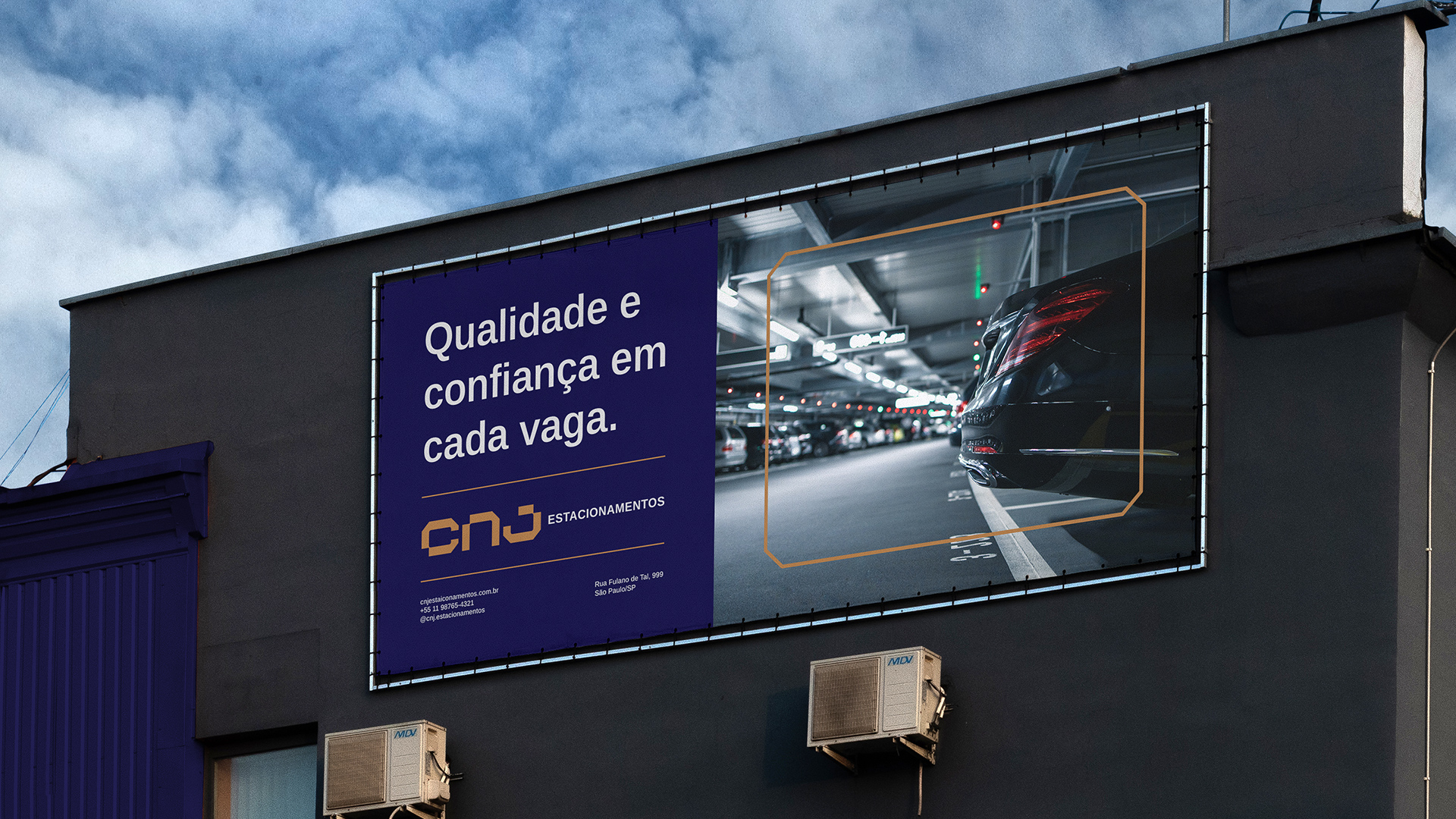 O conceito está nas construções e parâmetros para as vagas de estacionamento, nas formas retangulares e nos ângulos de 45º de algumas vagas. A paleta de cores precisaria ser marcante e trazes os atributos principais da marca; qualidade e confiança. O azul escuro transmite confiança, profissionalismo, seriedade e transparência enquanto o dourado e o cinza transmitem a elegância, luxo e requinte.