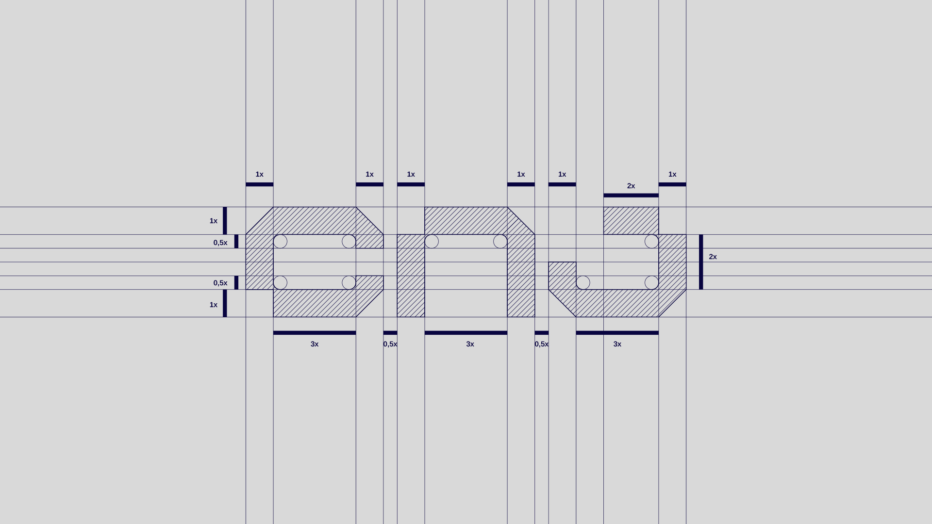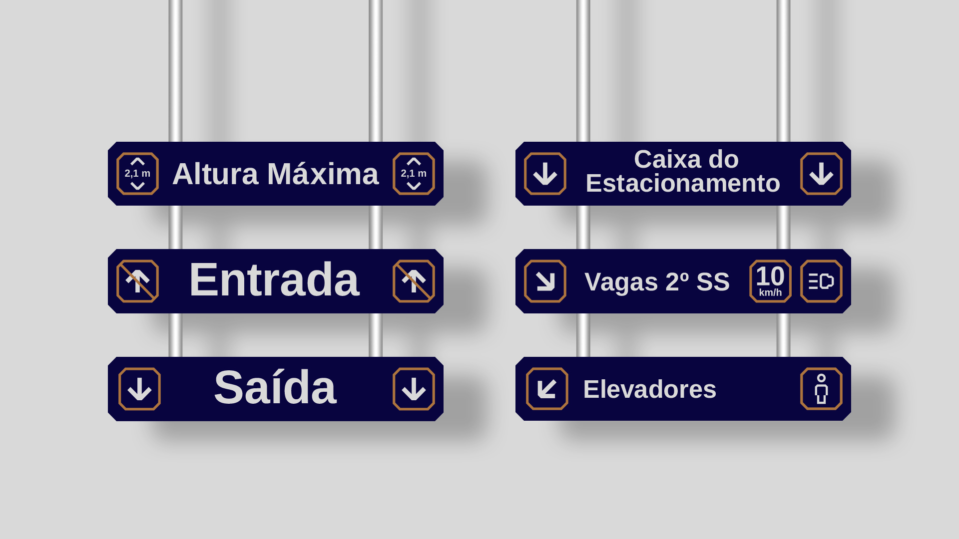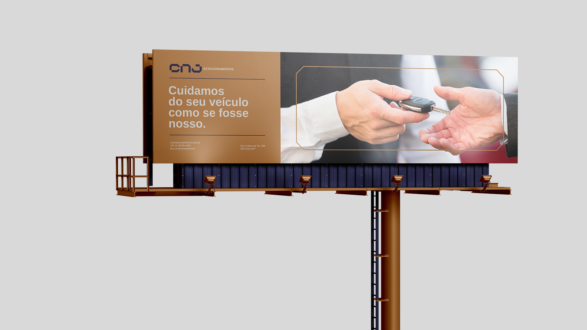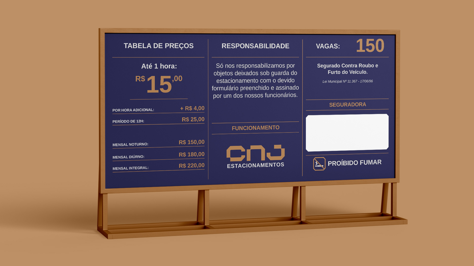 O conceito está nas construções e parâmetros para as vagas de estacionamento, nas formas retangulares e nos ângulos de 45º de algumas vagas. A paleta de cores precisaria ser marcante e trazes os atributos principais da marca; qualidade e confiança. O azul escuro transmite confiança, profissionalismo, seriedade e transparência enquanto o dourado e o cinza transmitem a elegância, luxo e requinte.